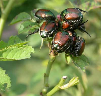 The adult of the Japanese beetle is bright metallic green and is about 3/8 inch long. It is smaller then the Green June beetle which is over ¾ inch long. The Japanese beetle wing covers are coppery colored and there are a series of tufts of white hairs on the abdomen. The larvae of the Japanese beetle are similar to other species of white grubs and have an off-white body with a brown head. They curl into a C-shape when not active. Japanese beetles larvae have a distinctive v-shaped row of spines on the end of the abdomen.